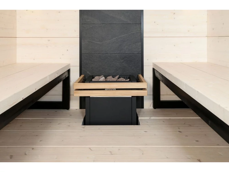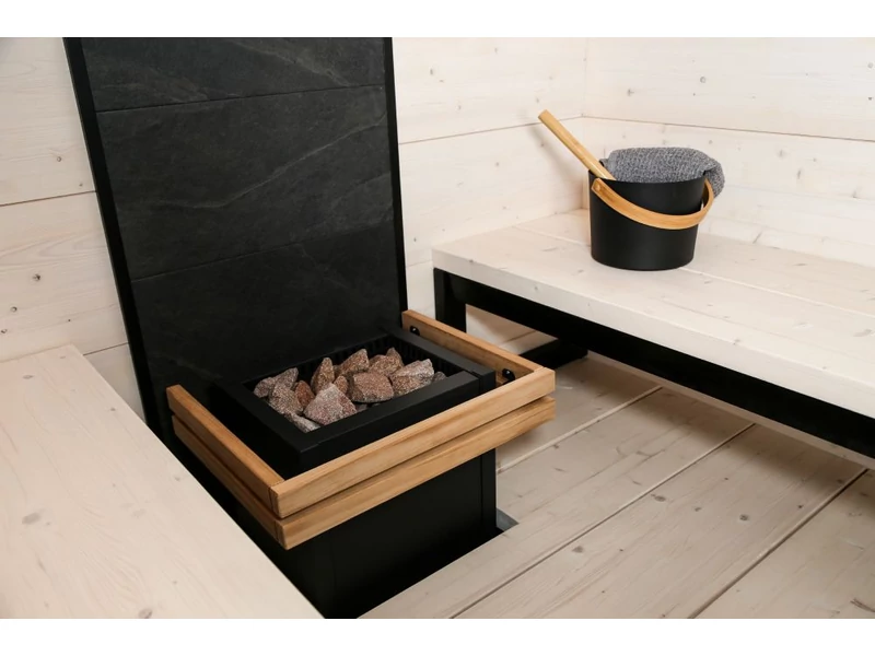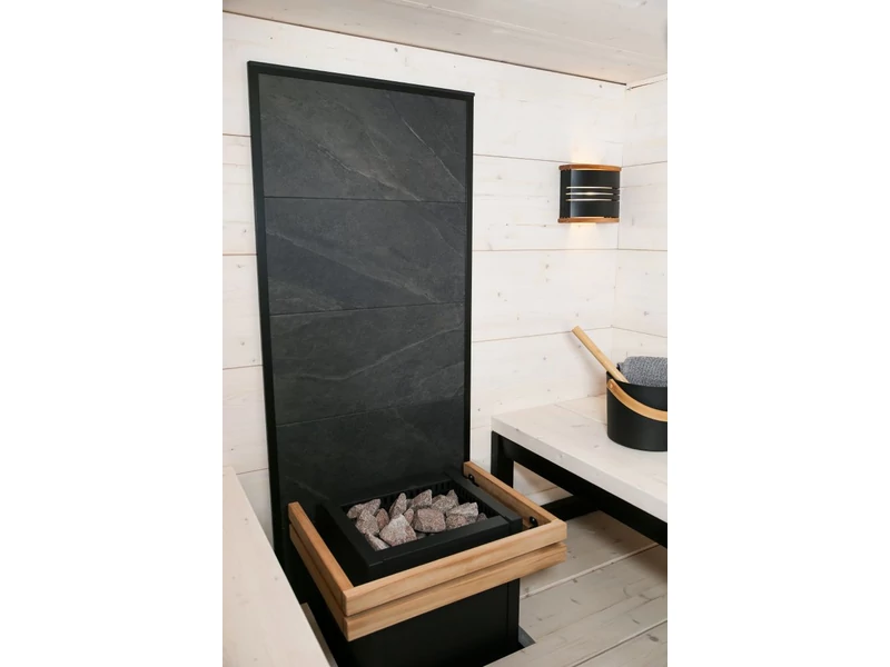 A HARVIA kőfalával egy szempillantás alatt friss megjelenést kölcsönöz szaunájának. A HARVIA kőfal egy kész elem, amelyet a kályha hátuljára rögzíthet, például egy fal vagy akár egy szauna teljes sarkának díszítésére. A HARVIA kőfal praktikus és tetszetős választás azok számára, akik nem akarják az egész szaunát felújítani, hanem a lehető legkönnyebben szeretnének kiemelni szaunája megjelenését. Könnyedén rögzítheti a HARVIA kőfalat közvetlenül a burkolat tetejére. Az alumínium sínek egyenes megjelenést kölcsönöznek szaunájának és a kőfalat külön megvásárolható LED világítással is felszerelheti. LED-lámpák használatakor ügyeljen arra, hogy ellenőrizze a fűtőtesttől való megfelelő biztonsági távolságot.