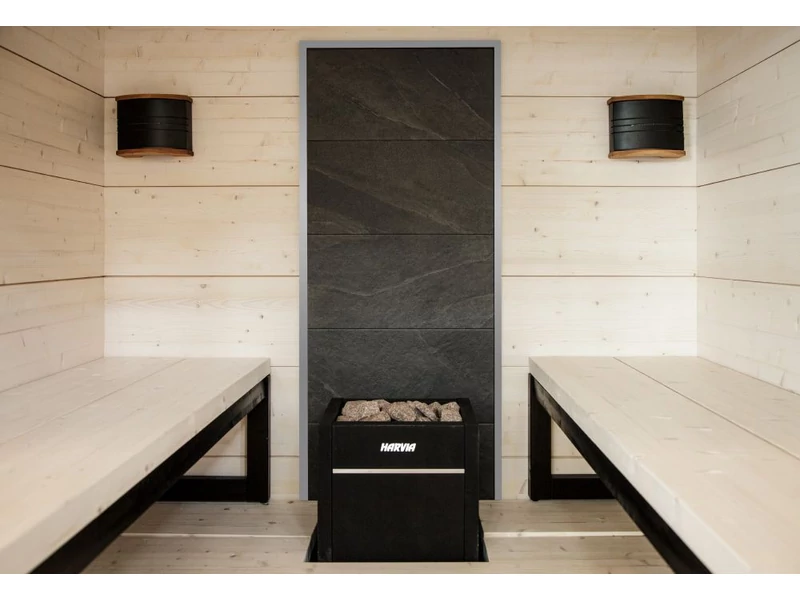 A HARVIA kőfalával egy szempillantás alatt friss megjelenést kölcsönöz szaunájának. A HARVIA kőfal egy kész elem, amelyet a kályha hátuljára rögzíthet, például egy fal vagy akár egy szauna teljes sarkának díszítésére. A HARVIA kőfal praktikus és tetszetős választás azok számára, akik nem akarják az egész szaunát felújítani, hanem a lehető legkönnyebben szeretnének kiemelni szaunája megjelenését. Könnyedén rögzítheti a HARVIA kőfalat közvetlenül a burkolat tetejére. Az alumínium sínek egyenes megjelenést kölcsönöznek szaunájának és a kőfalat külön megvásárolható LED világítással is felszerelheti. LED-lámpák használatakor ügyeljen arra, hogy ellenőrizze a fűtőtesttől való megfelelő biztonsági távolságot.