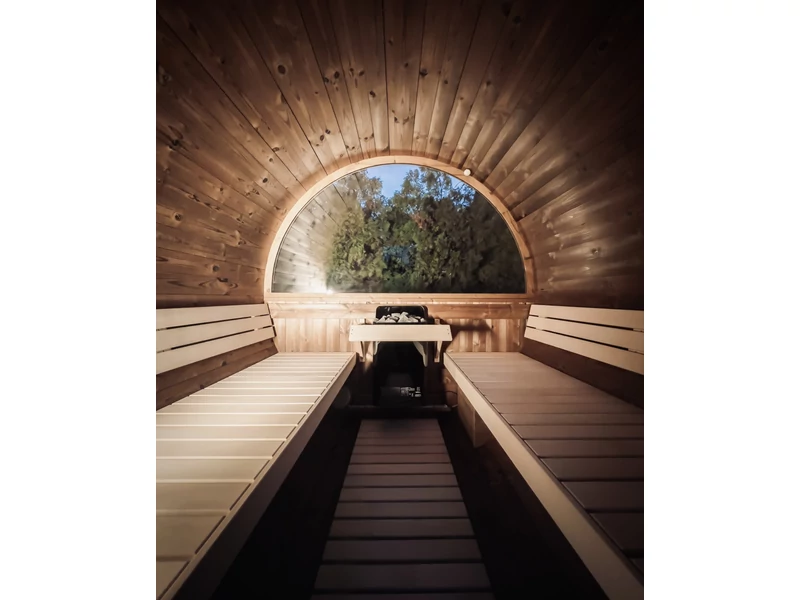 - A szauna egyik verziója félkör alakú ablakkal rendelkezik és ez elérhető 3 féle hosszal: