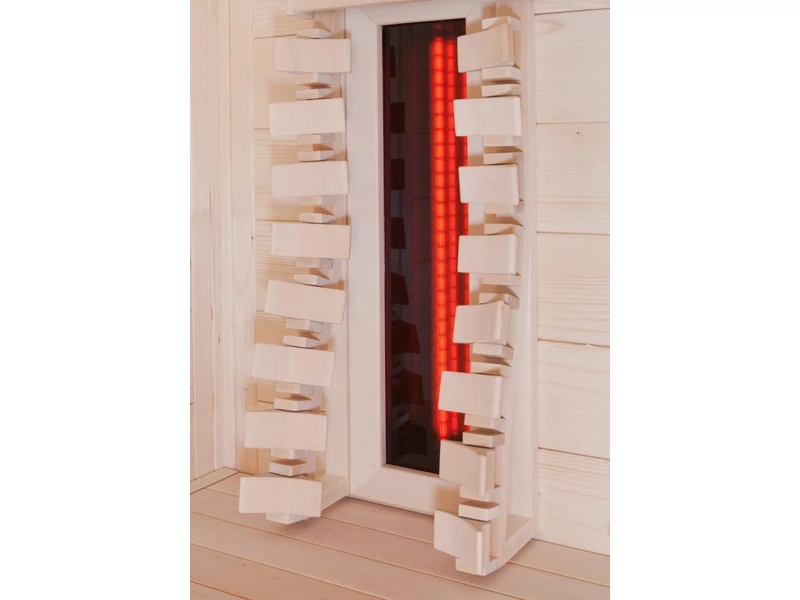 - Szabályozható rejtett LED hangulatvilágítás (meleg fehér). Ez a hangulatos szaunavilágítás nagymértékben hozzájárul szaunaélményének fokozásához!