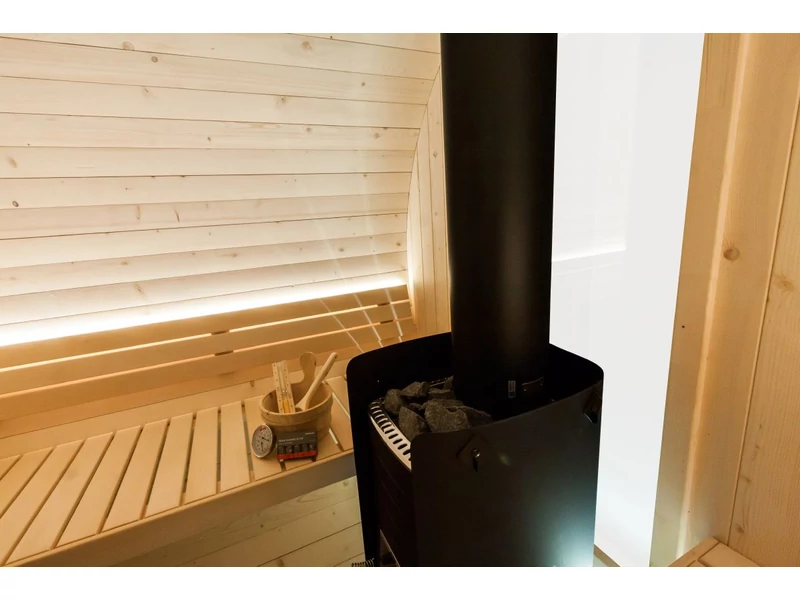 HÕELOSZTÁS: A kerek kivitel garantálja az egyenletes és gyors hõelosztást. A forró levegő a falak mentén kering és a szaunakályha felett újra felszáll, így a hordó szauna körös-körül felmelegszik.