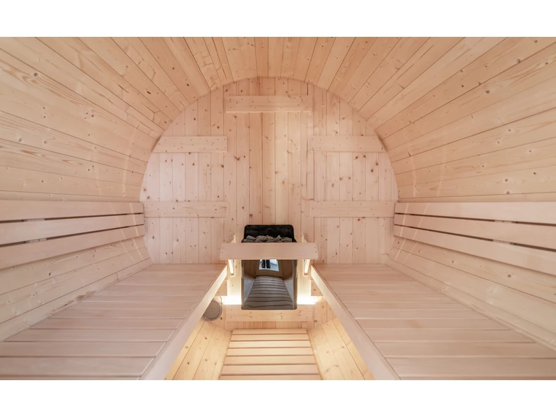 ENERGIAHATÉKONY: A hordószaunában a szokványos négyszögletű szaunákkal szemben kiesnek a kihasználatlan területek, mint pl. a padok alatt vagy a sarkokban. Ezáltal csökken az effektíve térfogat és ezzel a szükséges kályhateljesítmény.