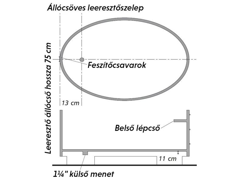 Alapfelszereltség: belépő, külső lépcső, leengedő szelep 1 ¼ Zoll, műanyag túlfolyócső
