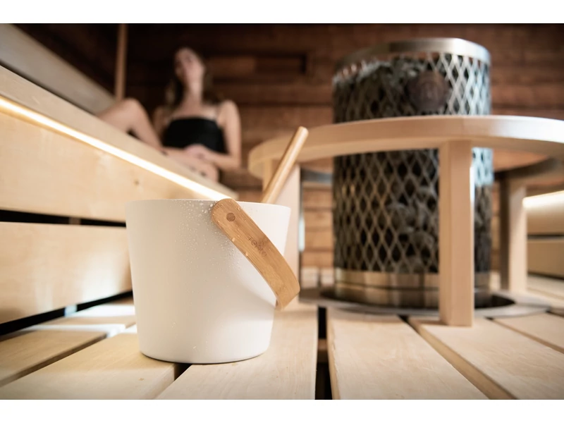 Ügyeljen a szauna dézsák és kanalak állapotára, hogy sok ideig tudja használni őket. Használat után ürítse ki, és ne hagyja őket a forró, párás szaunában! Szükség esetén tisztítsa meg a felületet enyhén szappanos vízzel, puha szivaccsal vagy kefével.