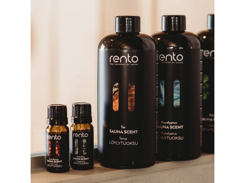 - Locsoljon az illatos vízből a szaunakövekre és hagyja, hogy a Rento szaunaillatok érzéki kényeztetésbe részesítsék.