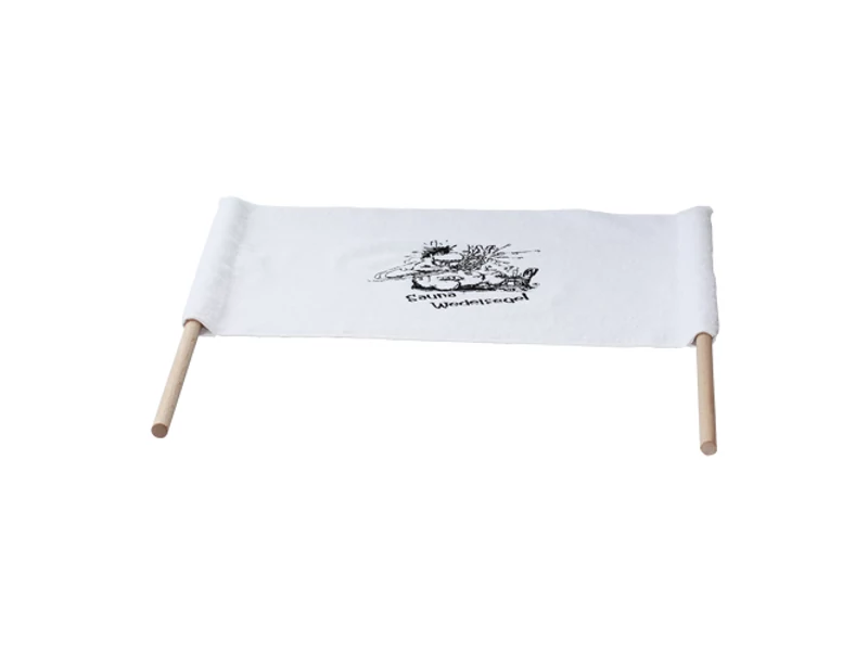 A kiváló minőségű frottír huzat helyes kis szaunázó emberkét ábrázoló motívummal van hímezve. Jobbról és balról egy-egy kis táska található, amikbe könnyedén beleilleszthető a zászló egy vagy mindkét rúdja.